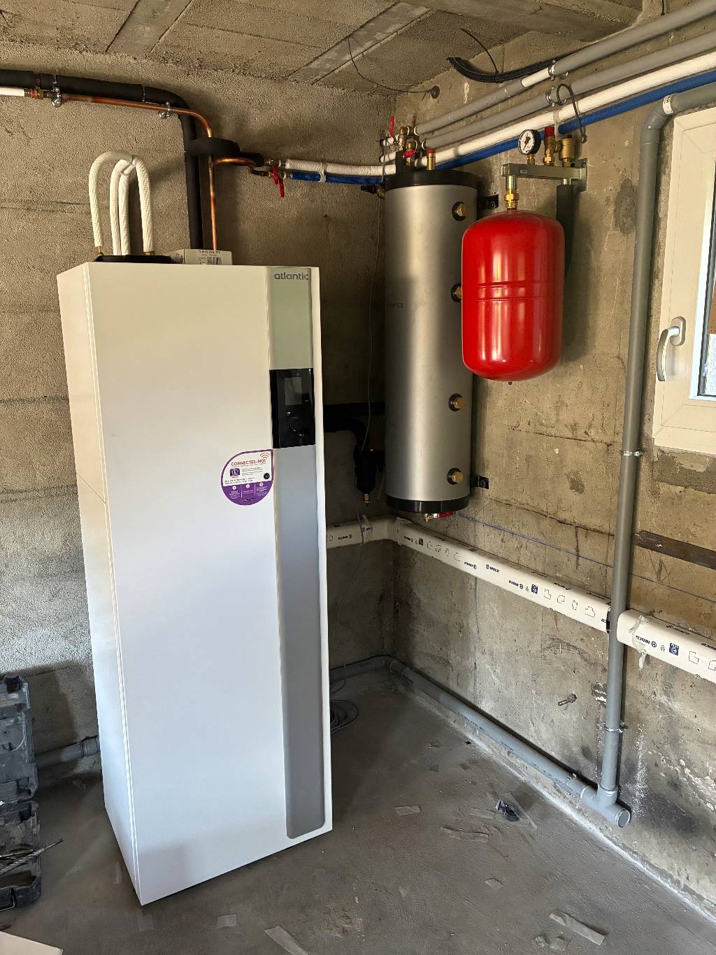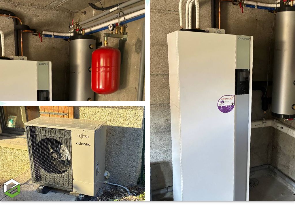 Le système installé est une pompe à chaleur Atlantic Alféa Excellia S Duo 12 kW triphasée au fluide R32, assurant à la fois le chauffage de l’habitation via un réseau de radiateurs existants et la production d’eau chaude sanitaire. L’installation est complétée par la mise en place d’un vase d’expansion de 25 litres permettant d’assurer le bon fonctionnement hydraulique du circuit.